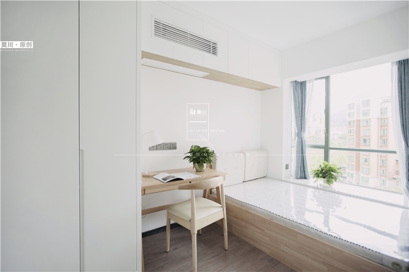我們通過(guò)把主臥的房門換個(gè)位置,解決了大門正對(duì)房門的問(wèn)題,在主臥的床位做了一排的衣柜,床靠邊放置,主臥進(jìn)門口做了玻璃移門形式的衣柜和梳妝臺(tái)做了很好的結(jié)合。