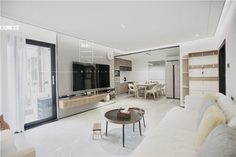 客廳因現(xiàn)場(chǎng)結(jié)構(gòu)的采光的因素,沙發(fā)的擺放沒(méi)有做更改,但是我們通過(guò)用柜體做隔墻的方式,在客廳多了很多儲(chǔ)物空間。