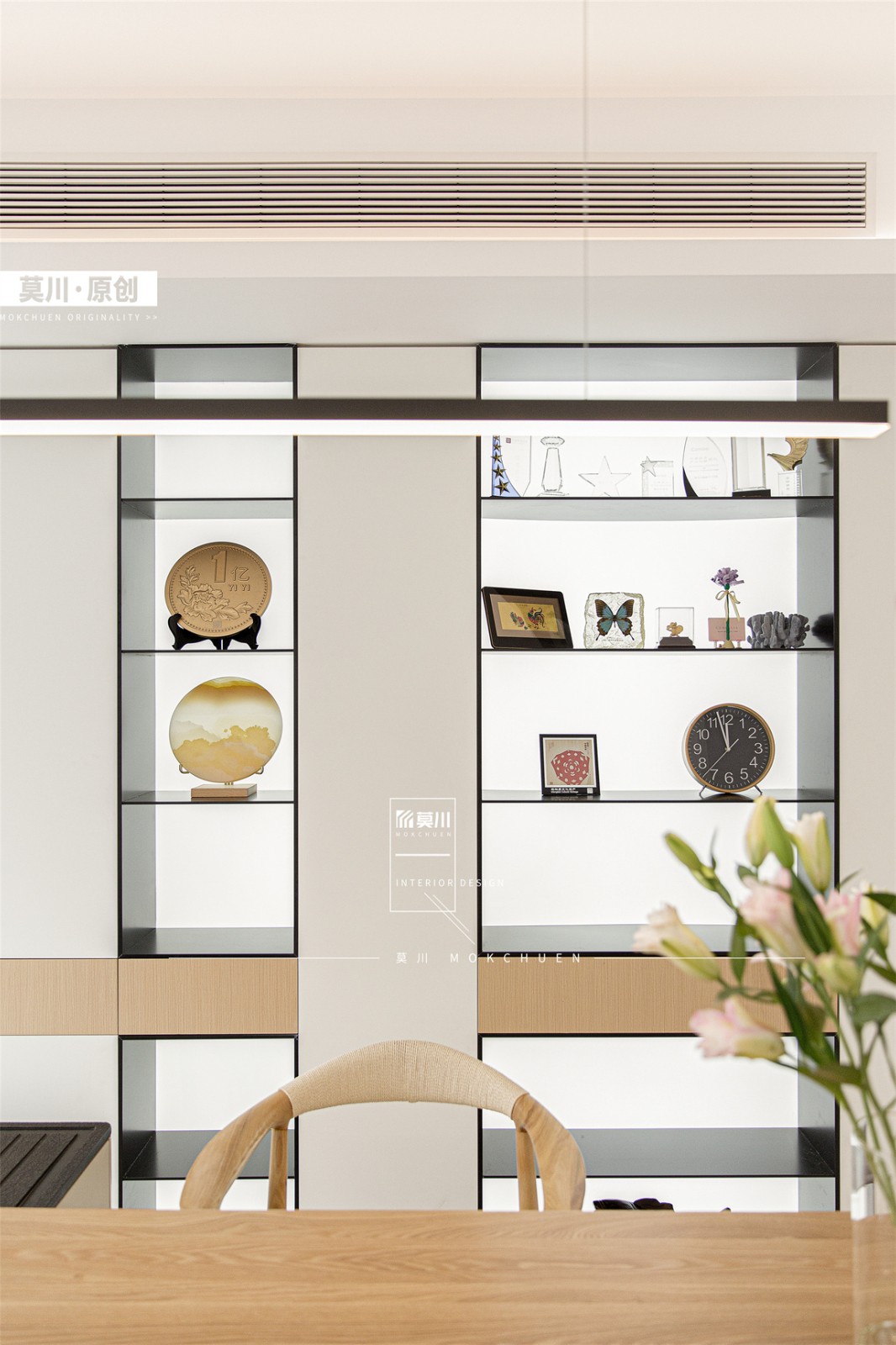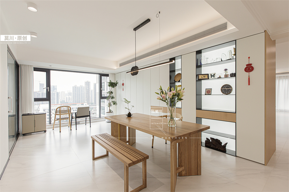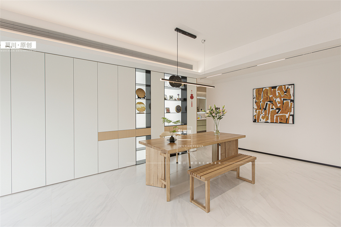整體空間以柔和的木色簡約的白色為基調,溫暖又有自然的質感,詮釋了家的溫度。茶室寧靜素雅開放格的透光板增加燈光的層次也更好展示收藏,一幅靚麗的掛畫增加空間活力將視線引入過道走到客廳。客廳餐邊柜木色與小朋友活動區整體木色增加空間的自然與溫馨感,柜體下面開放格方便小朋友玩具收納,對面的黑板漆特別選擇成了與木色同色的漆面而非常規的黑色。媽媽懷抱椅舒適放松與茶室掛畫呼應,電視背景墻巴士移門美觀又實用,雙面沙發一面觀影一面休閑,增加客廳多種社交模式,洄游過道天花與墻面整體統一木色,對面墻體則是作為小朋友的繪畫作品展示區與鋼琴練習區,過道成為小朋友才藝展示,藝術與實用功能相結合。主臥沿用客廳色系基調,利用衣柜與墻體的凹位形成端景位,木飾面與背景墻連成一體,波浪板增加層次與五斗柜呼應。