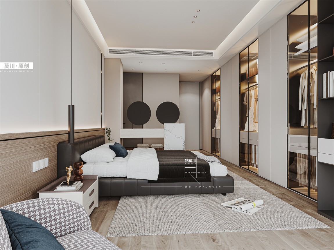 主臥墻借客廳15公分,床尾整面衣柜收納,解決收納痛點。