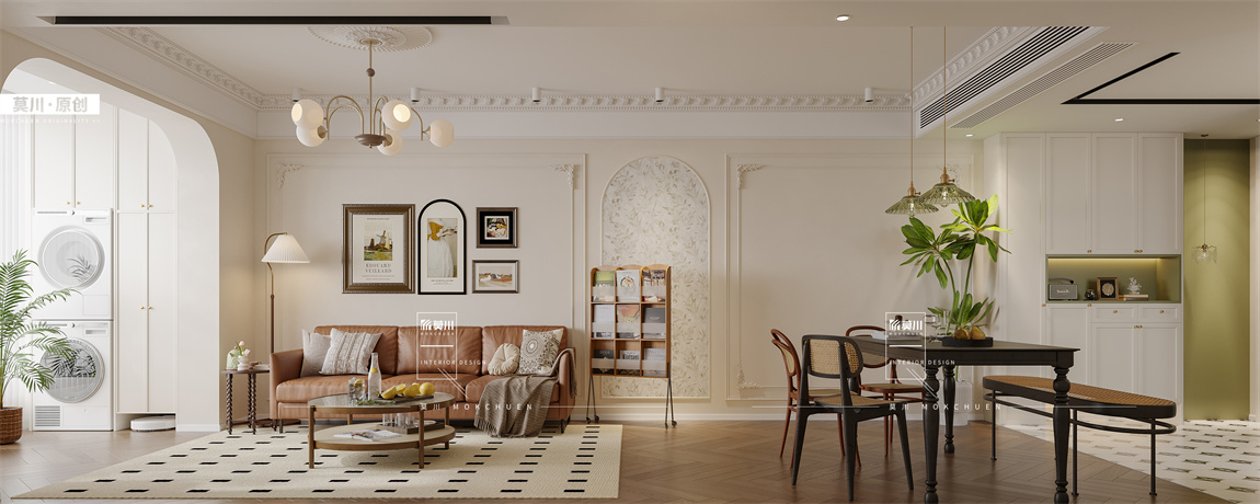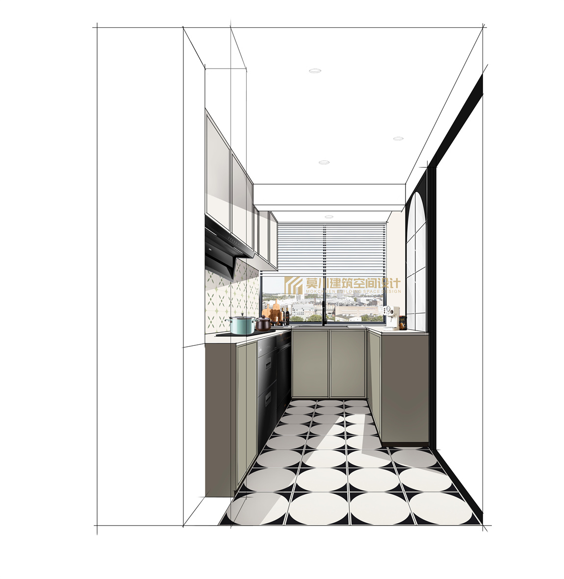 設(shè)計(jì)亮點(diǎn):半開放廚房的設(shè)計(jì),聯(lián)動(dòng)門+折疊窗增加法式元素