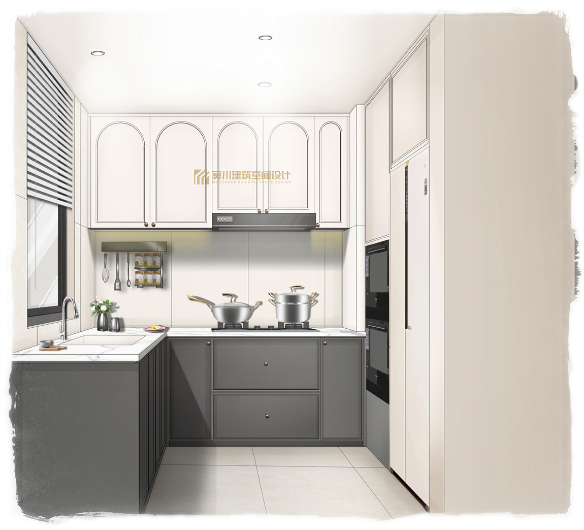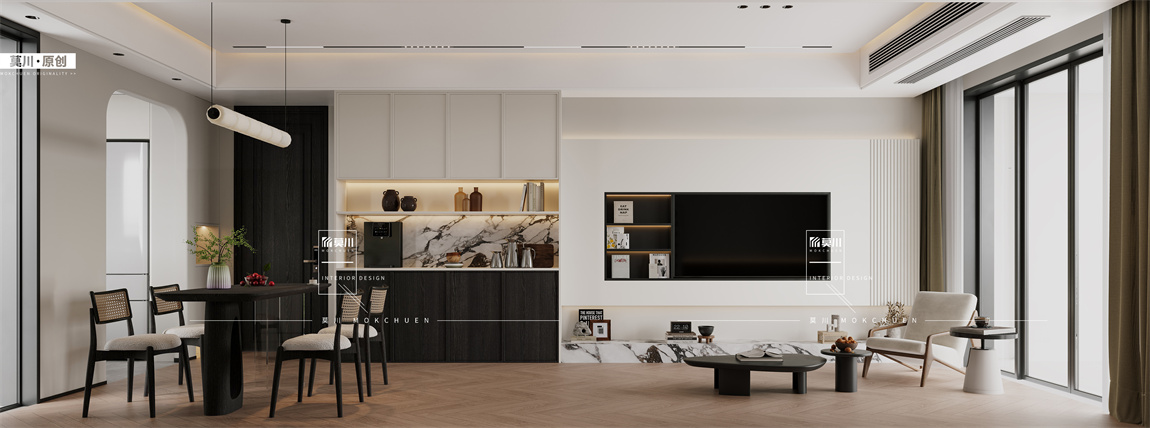 全房保持大的基調是極簡的素色,但是通過計算黃金比例的墻體分隔切線保證空間的序列感,,木紋和石材兩種不同屬性不同紋理的材質碰撞拉伸了整體的質感。在里面設計中大量采取了內推和視覺眼神,餐廳收納柜為了使得空間延伸感特別使用了發光背板,在視覺上得到較大的眼神,電視柜使用黑色煙熏木紋顏色的高級感打破了收納柜的大面積逼近感,開口處內推了18mm 一進一退 空間完美得到橫向上的延申.